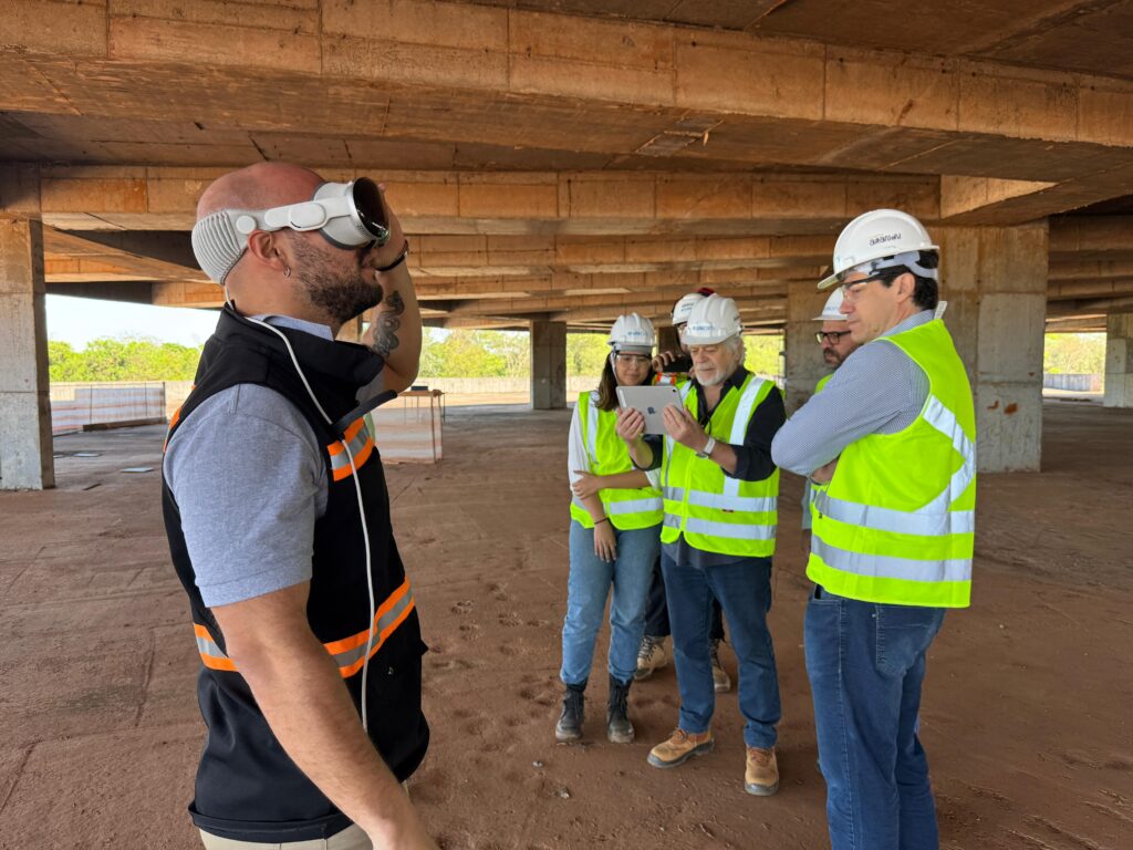 Em seguida, o arquiteto foi apresentado à equipe do consórcio MPD & Ankara UNILA, responsável pela execução da obra, que apresentou ao arquiteto a inclusão dos projetos em um programa de realidade virtual, o que permite identificar, de forma rápida e eficiente, possíveis ajustes de compatibilização de projetos.
