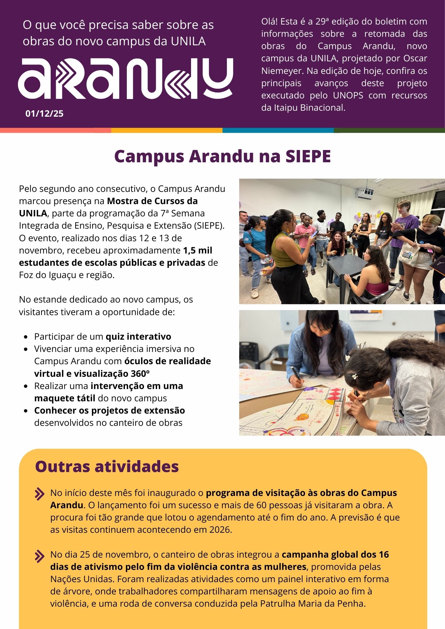 Olá! Esta é a 29ª edição do boletim com informações sobre a retomada das obras do Campus Arandu, novo campus da UNILA, projetado por Oscar Niemeyer. Nesta edição, saiba mais sobre os avanços da construção e sobre a participação do Campus Arandu na 7ª edição da SIEPE.