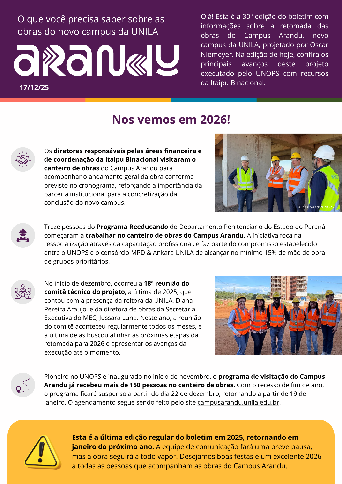 Olá! Esta é a 26ª edição do boletim com informações sobre a retomada das obras do Campus Arandu, novo campus da UNILA, projetado por Oscar Niemeyer. Nesta edição, saiba mais sobre o andamento do canteiro de obras, sobre as atividades do conselho executivo e do comitê técnico e sobre as demais atividades lideradas pelo UNOPS.