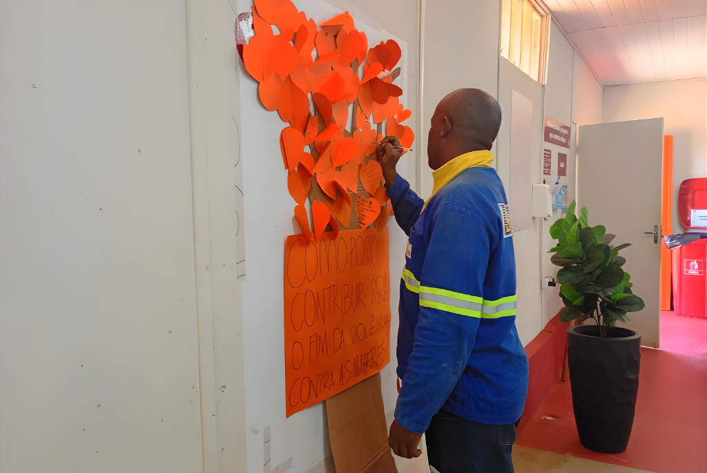 As atividades realizadas no canteiro do Campus Arandu incluíram uma reflexão interativa, como forma de materializar o compromisso de trabalhadores e trabalhadoras pela igualdade de gênero. No refeitório, foi instalado um painel em formato de árvore com a seguinte pergunta: “Como posso contribuir para o enfrentamento à violência contra mulheres e meninas?”.