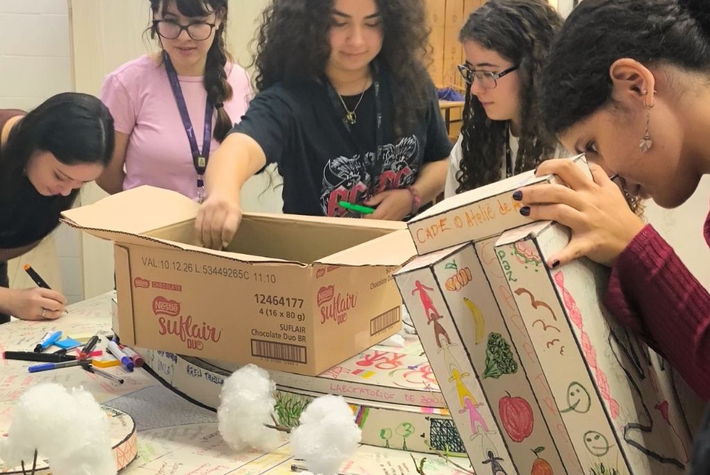 Acadêmicos interagindo com a maquete colaborativa do Campus Arandu. Foto: Nathaly Nunes/UNOPS.